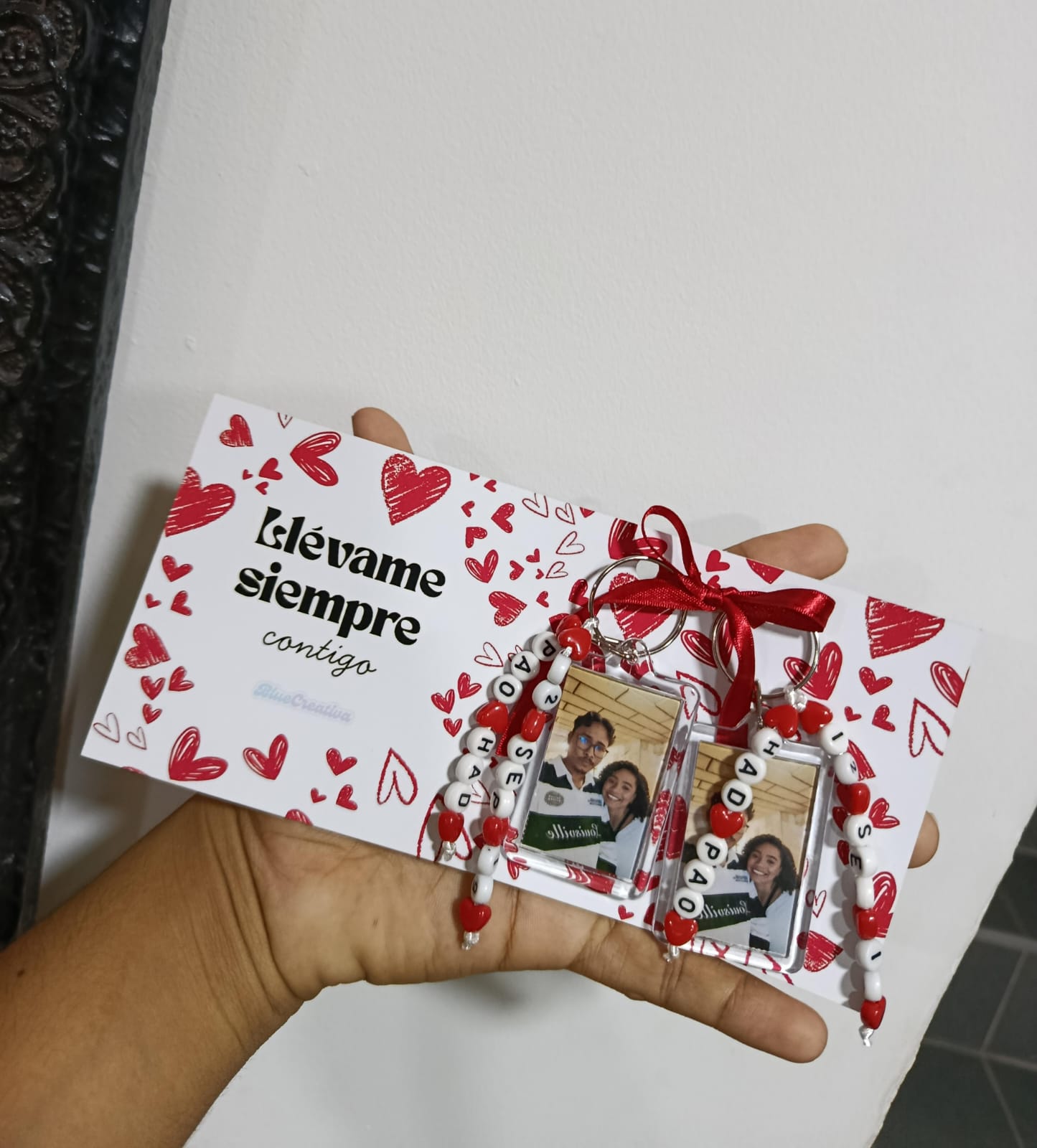 Cada set incluye dos llaveros rectangulares personalizados, diseñados con cuidado y hechos con amor por BlueCreativa.
